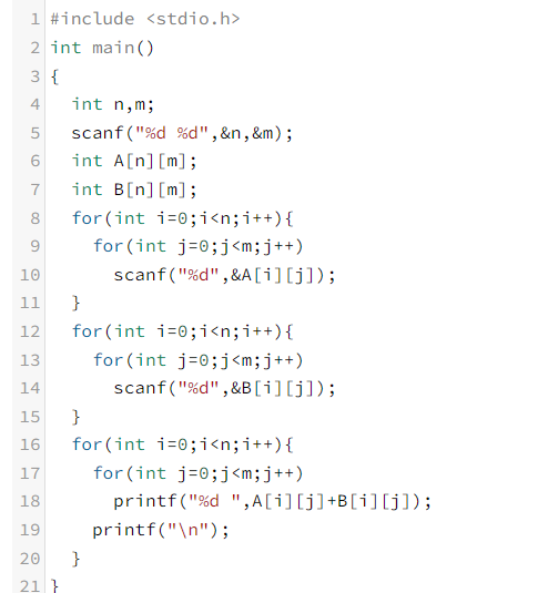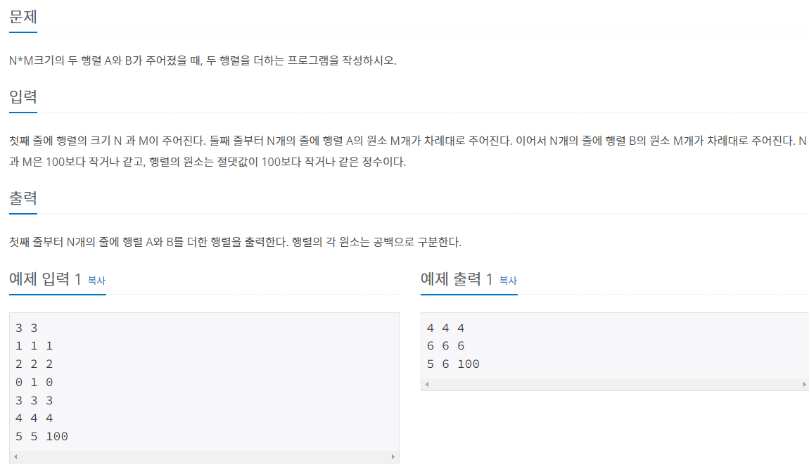 먼저 변수 n과 m을 입력받고 행렬 A와 B의 크기를 nxm으로 둔다. 그리고 이중 반복문을 각각 n과 m 만큼 반복하고 행렬 A와 B에 하나하나씩 입력해 나간다. 그리고 마지막에 다시 이중 반복문을 각각 n과 m 만큼 반복하고 A와 B의 같은 위치끼리 더한 값을 출력한다.